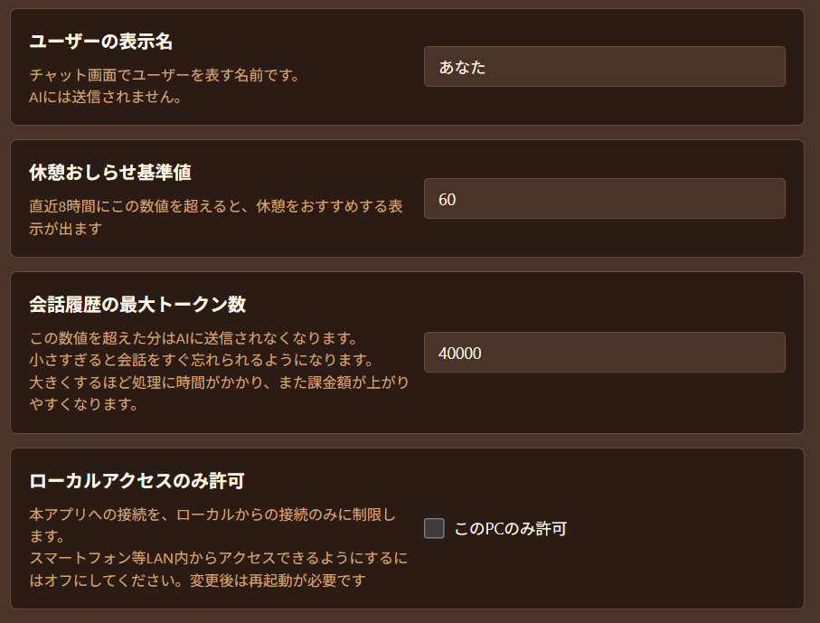 - 会話履歴の最大トークン数 : 古い会話もAIに見てほしいとき (これは厳密なトークン数ではなく概算です)
